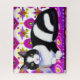 Puzzle in an illustration of a black and white tuxedo cat on a cushion, with an exotic, patterned background in shades of magenta and purple