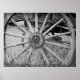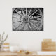 A black and white photo of an old wagon wheel with buffalo grass growing up around it. Taken in Montana.