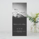 Black and white wedding under the mountains. Landscape photograph of a snow covered mountain with darkness below and white cloudy sky above. Names of the couple are in black font above the mountain in the sky and all the details are in white font below the mountain. Completely customisable and personalizable wedding products.