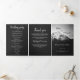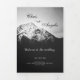 Black and white wedding under the mountains. Landscape photograph of a snow covered mountain with darkness below and white cloudy sky above. Names of the couple are in black font above the mountain in the sky and all the details are in white font below the mountain. Completely customisable and personalizable wedding products.