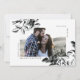 Antique wild rose graphics in a modern black and white frame your landscape engagement photo alongside elegant custom text with room for more information on the back of the card.