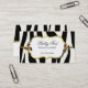 Elegant animal print business card, with a black and cream coloured zebra print as a background, on both the front and back of the card. A decorative gold tone stripe runs across the middle, on the front and backside. A gold looking framed text area has pretty graphics of gold leaves, on either side, and black customisable text ready to personalise for your business.