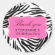 Black and white zebra pattern thank you stickers for birthdays. A hot pink shape in the middle where you can put your text.