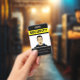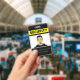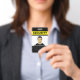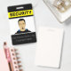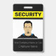 This custom employee photo identification badge features a sample photograph in the centre. The title "SECURITY" is printed above it in bold black font over a yellow background. The yellow strip helps to make the word Security stand out and be noticeable. You can include your company name or addition text below the image, as well as an employee name. The back of the badge features additional employee or company information printed over a black background, with a sample barcode placed at the bottom. You can replace the scan code with your own, or another image, such as a custom logo.