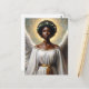 Postcard features oil painting artwork of a dark-skinned angel woman with short natural hair, large white wings, and a white dress with a halo and floral crown. Serene angelcore aesthetic featuring a melanin-rich female supernatural figure. Original black girl angel art by Dee Claire.