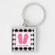 A keychain featuring a background of black argyle. Pink flip flops illustration inside square at centre. Personalise with your name.