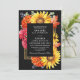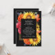 Set the stage for an elegant event with this autumn wedding invitation. A lush and luxurious floral wedding invitation featuring a frame of sunflowers, red mums, lantanas, black-eyed susans, autumn leaves, and blue berries against a black background. On the back of the invites is a QR RSVP code and wedding details. It is perfect for a dramatic and unforgettable celebration. They are ideal for those who appreciate timeless allure. PLEASE NOTE: The gold featured in this design is NOT REAL foil.