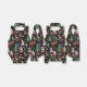 Christmas-themed pattern featuring Santa Claus, reindeer, snowmen, elves, Christmas trees, candy canes, and snowflakes on a black background