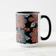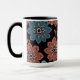 An accent mug with black handle and black interior. Also with a black background with floral.