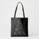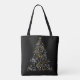 Christmas illustration pattern on a black background in the shape of the Christmas Tree; reindeer, candy canes, holly, baubles, candles, toys etc.