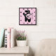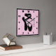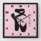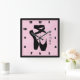 An illustration of a pair of black ballet shoes / slippers standing in the classical and contemporary ballet dancers pose up on the tips of their toes, known as en pointe. The background is pink with little white polka dots.