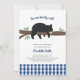 Black bear cub baby shower invitation features a sweet, sleeping baby bear on a tree branch with blue and white buffalo check accents. Watch collection for newly added coordinating items.