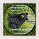 Black bear sitting in a lush green forest surrounded by birch trees, framed by decorative foliage.