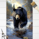 This detailed illustration features a black bear standing in a river, its strong frame surrounded by flowing water and natural elements. The contrast of the bear’s dark silhouette against the gentle river evokes the raw beauty and tranquillity of the wilderness.