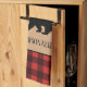 In the centre is a silhouette of a black bear with text templates above and below in black lettering so you can personalise. this image and text is inside a burlap square with a black border. The background pattern is a lumberjack red and black buffalo plaid.