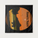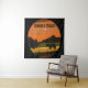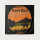 Black Bear silhouette tapestry with earth tone colours on background. Mountains, trees, birds, and sun with a black bear on this outdoorsy, wildlife design with personalised name.
