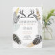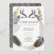 Boho tribal Birthday Party invite adorned with black, grey and neutral feathers, arrows and deer antlers. Have a pow wow birthday party with this invite