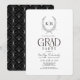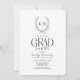 This chic graduation party invitation features a white background with a monogram surrounded by a botanical crest and a bow in black. The reverse side features a black background with geometric patterns. Personalise it for your needs. You can find matching products at my store.