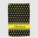 This design has a black background with bright yellow polka dots and bright yellow, black and white stripes. The name is in a script font and can be customised using the template field.