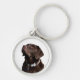 This cute keychain features a portrait of a beautiful brownish black Labrador Retriever with a crisp white background.
