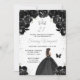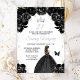 This elegant and glamourous birthday party invitation features a beautiful princess with brunette hair in a black ball gown. The text combines handwritten script and modern sans serif fonts for a classy and sophisticated look. The floral arrangements, butterfly and silver confetti create the perfect blend of rustic and chic.