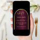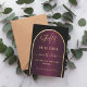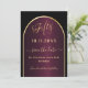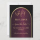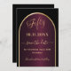 A Save the Date card for a 50th birthday party. A black and burgundy background, decorated with a faux gold arch. Personalise and add a date and your name. The text: Fifty and Save the Date is written with a large trendy hand lettered style script.
