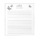 This notepad features Destei's design of black and white butterflies. There are three butterflies on the top while most of the notepad is lined with thin black lines. The top of the notepad also has personalizable text areas for a title and for a name.