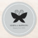 Black Butterfly paper coaster features an elegant black butterfly with spread wings and a pair of curly antennae, all on a pale grey background and within a round white border, with custom text. © Morning 6