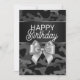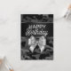 Custom birthday card with "Happy birthday" in mixed typography, silver bow, black satin ribbon, and black camouflage background.