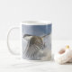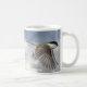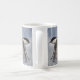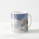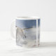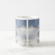 Photograph of a black-capped chickadee in flight against cloudy sky. Design on both sides of mug.
