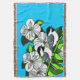 Black Capped chickadee and dogwood flower art with black outline on light bright blue background