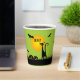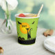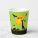 Bats in the sky fly above a green-eyed black cat and leering jack o' lantern on these Halloween paper cups. MATCHING items in our collection.