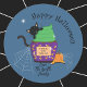 Some cute blue stickers featuring a black cat hiding behind a Halloween cupcake with a green icing . Personalise it with your name . Perfect to seal favour bags at a kids party .