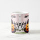 Bats in the sky fly above a scared black cat and a creepy leering jack o' lantern on these fun Halloween mugs.