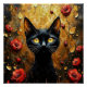 A cute black cat with large yellow eyes and red roses on a gold and brown mott;ed background