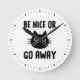 A humourous wall clock for the home or office. "Be Nice or Go Away" with black cat. Makes an original gift. Check out Jenn’s Doodle World for even more novelty clocks and animal themed home decor.