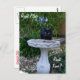 Aarg is the all-black cat who lives next door to my sister. An opportunist, he stops by for treats, but also for affection. In this photograph, he is perched on the edge of a grey stone birdbath, looking up from a refreshing drink. Behind Arg and the birdbath are green leaves of bamboo and a raceme of light blue flowers. Under and around Arg is brown mulch, with a few fallen, light tan bamboo leaves Against the green are written the words, "Right Place. . ." in white lettering, at the top of the image. In the lower right corner the sentiment continues: "Right Time?" Arg's bright green eyes stand out in his black face. He invites petting and, I may add, is as soft as he looks! Copyright Gail Storrs 2011.