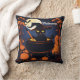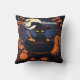 A mystical black cat stirs a cauldron surrounded by festive pumpkins, with curious companions watching under a glowing full moon.
