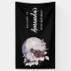Birthday banner with a watercolor painting of a black cat and a light purple and pink floral bouquet. Standing in front a a large full moon. Stylish and magical.