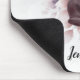 A mouse pad with a watercolor painting of a black cat and a light purple and pink floral bouquet. Standing in front a a large full moon. Stylish and magical.
