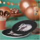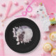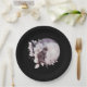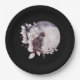 Paper plates with a watercolor painting of a black cat and a light purple and pink floral bouquet. Standing in front a a large full moon. Stylish and magical.