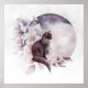 A poster with a watercolor painting of a black cat and a light purple and pink floral bouquet. Standing in front a a large full moon. Stylish and magical.