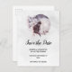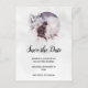 Save the date postcard with a watercolor painting of a black cat and a light purple and pink floral bouquet. Standing in front a a large full moon. Stylish and magical.