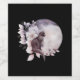 Bottle labels with a watercolor painting of a black cat and a light purple and pink floral bouquet. Standing in front a a large full moon. Stylish and magical.