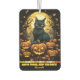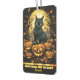 Under the glowing light of a full moon, a sleek black cat sits majestically amidst a cluster of carved pumpkins. Each jack-o'-lantern grins with delight, while autumn leaves dance around the scene.