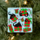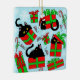 Cute black cats in or around wrapped Christmas presents with snowflakes against a light blue backdrop