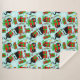 Cute black cat in or around wrapped red and green Christmas presents with snowflakes against a light blue backdrop