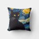 Throw pillow with illustration of a beautiful black cat against blue and yellow background.