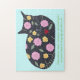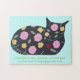 Painting of a black cat laying, decorated with flowers and plants that are listed as safe for cats to eat, are printed on custom puzzles. The plants include Gerber daisy, nasturtium, cereal grass, and catnip, and are listed on the puzzle. Thank you for shopping CherylsArt on Zazzle.