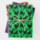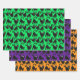 Black cat halloween wrapping paper set of 3 sheets, featuring a trendy cat pattern on a green, purple and orange colour backgrounds. For matching products please browse the Black Cat Halloween Collection in my store.